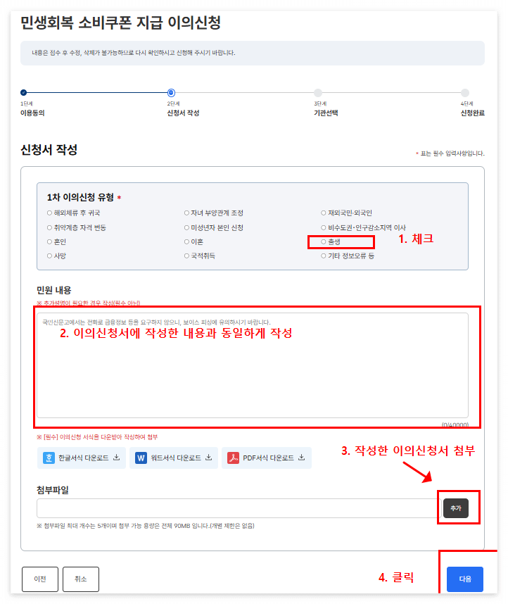 - 이의 신청서 작성 및 파일 첨부하기